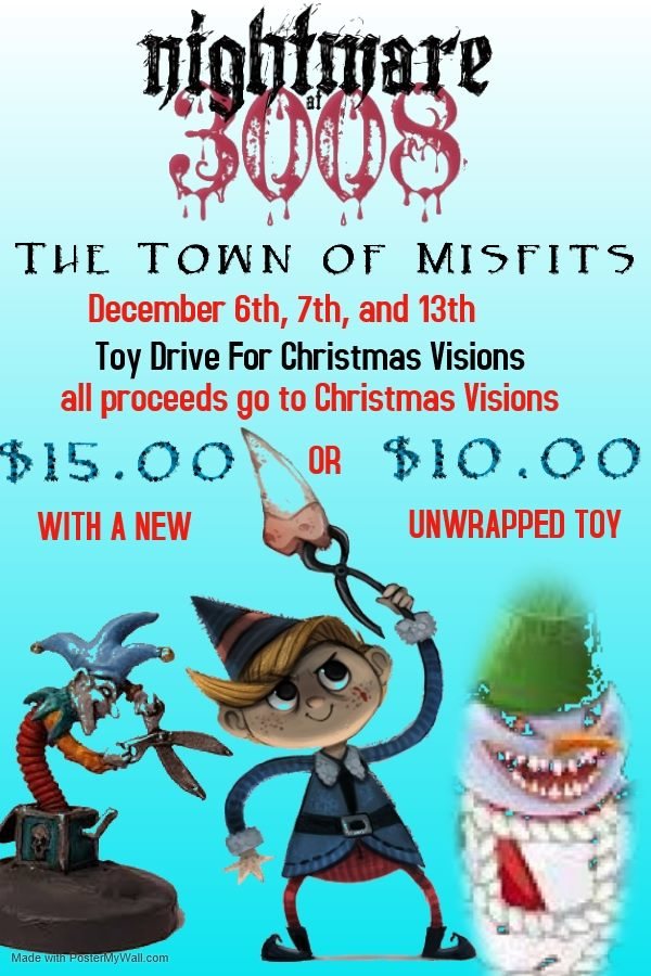 Join Nightmare at 3008 as it presents a Christmas Toy Drive on Friday, December 13th from 7:30 p.m. to 11 p.m. Admission is $15. Save $5 off admission when you bring a new unwrapped toy. The toy drive and all proceeds go to Christmas Visions.